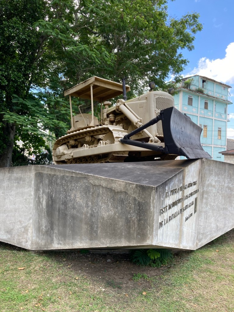 The following day I mooch about to get a feel for the place. It’s very different to Havana (unsurprisingly), and whereas I couldn’t walk 10m in Havana without being hassled, I’m refreshingly ignored here. I checkout a local tourist attraction. It’s a tractor. Well, not exactly a tractor., a machine with caterpillar tracks and a flat blade at the front (do they have a name?). It sits proudly on its plinth at the exact spot where it became famous. It’s on the site of a crucial victory for the Cuban revolution. Che Guevara led a band of about 50 people (women fight too) against a larger contingent of state forces assigned to hold the city from the advancing rebels. An armoured supply train full of troops and weapons to re-enforce the garrison arrived at the train station when the rebels attacked. One of them used the tractor to rip up the train lines and the train derailed. After a short battle, all of the government forces surrendered. When learning of this loss, the fascist dictator President Batista saw the writing on the wall and fled the country.