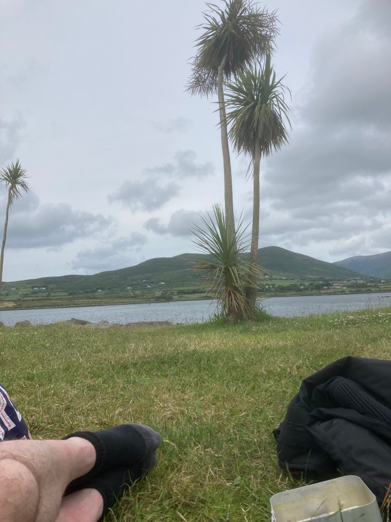 I survived the night and the bright sunshine of the following morning was so regenerative. I’d spotted a little place by the sea nearby so headed there for a morning dip to wash off off the crusty camping sleep from my eyes. How lovely it was. This part of Ireland appears to be very up market. Lots of golf courses and fine dining gastro pubs, tourist coaches with fat-walleted Americans. Not particularly my cup of tea but it is nice and worthy of a longer explore another time. I worked my way south west to place called Cahersiveen and set up camp in one of the best campsites I’ve ever been to. Right on the banks of the sea inlet. Thankfully with enough breeze to keep the midges at bay. A lovely host and an idyllic location with all the necessary facilities, including a common room with the usual board games but guitars and other stringed instruments hanging on the walls, lovely.