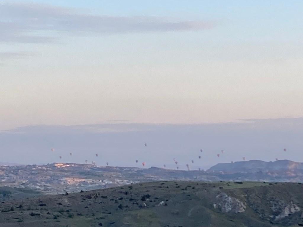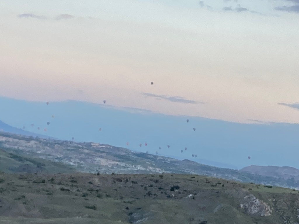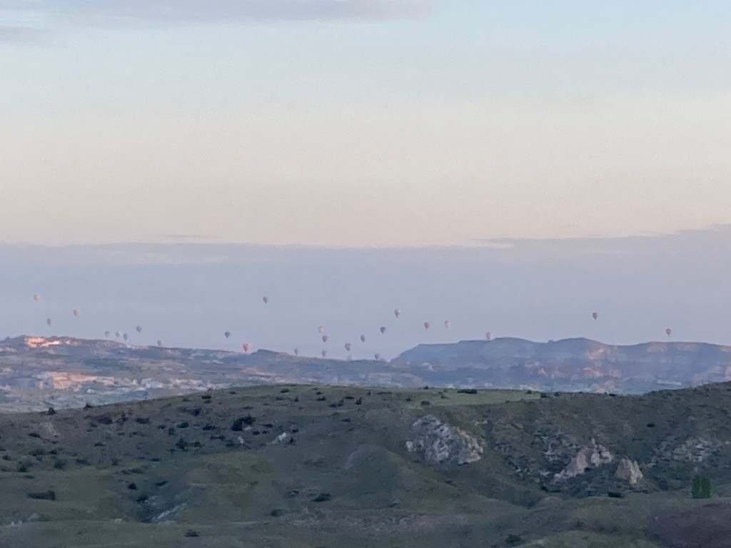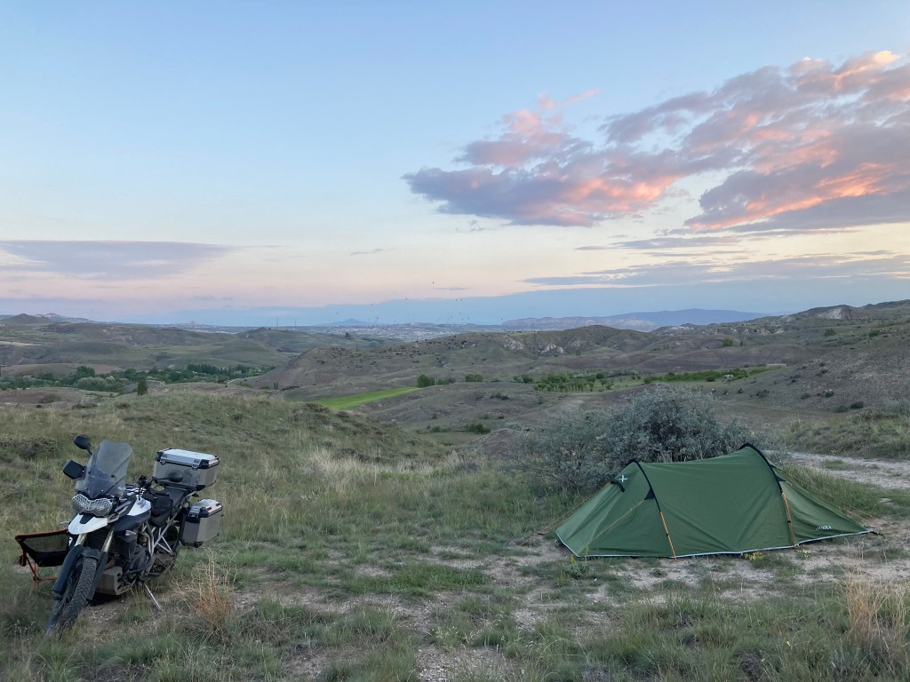 I worked out that even covering 400 or so miles a day, I’d still need 2 more stops in Turkiye, so I decided to route through Cappadocia, the tourist and insta friendly village with thousands of cave dwellings and a famous hot air balloon location. Again I opted to wild camp. I’d picked a spot using google maps that looked off road, but had a dirt track and was some way from any dwellings, I hoped to get set up there about dusk and be off at dawn. Everything was going fine and it was an awesome camping spot until about an hour after I fell asleep I could hear a car getting closer and closer… oh dear. Then the engine stopped … oh shit! And I heard a voice “hello… hello…” “erm … hello?”, “ do you need anything?” “erm… no thanks I’m just gonna camp and be off early in the morning” “ ah OK, let me know I you need anything”…. and off the car went. How he got up the steep dirt track that I struggled with on the bike, I’ll never know. I think he was just showing some accommodating Turkish hospitality but bloody hell mate didn’t you think it would spook me in the pitch black at 11pm? Again I was more than happy to awake in one piece at the crack of dawn and I was in for a treat.