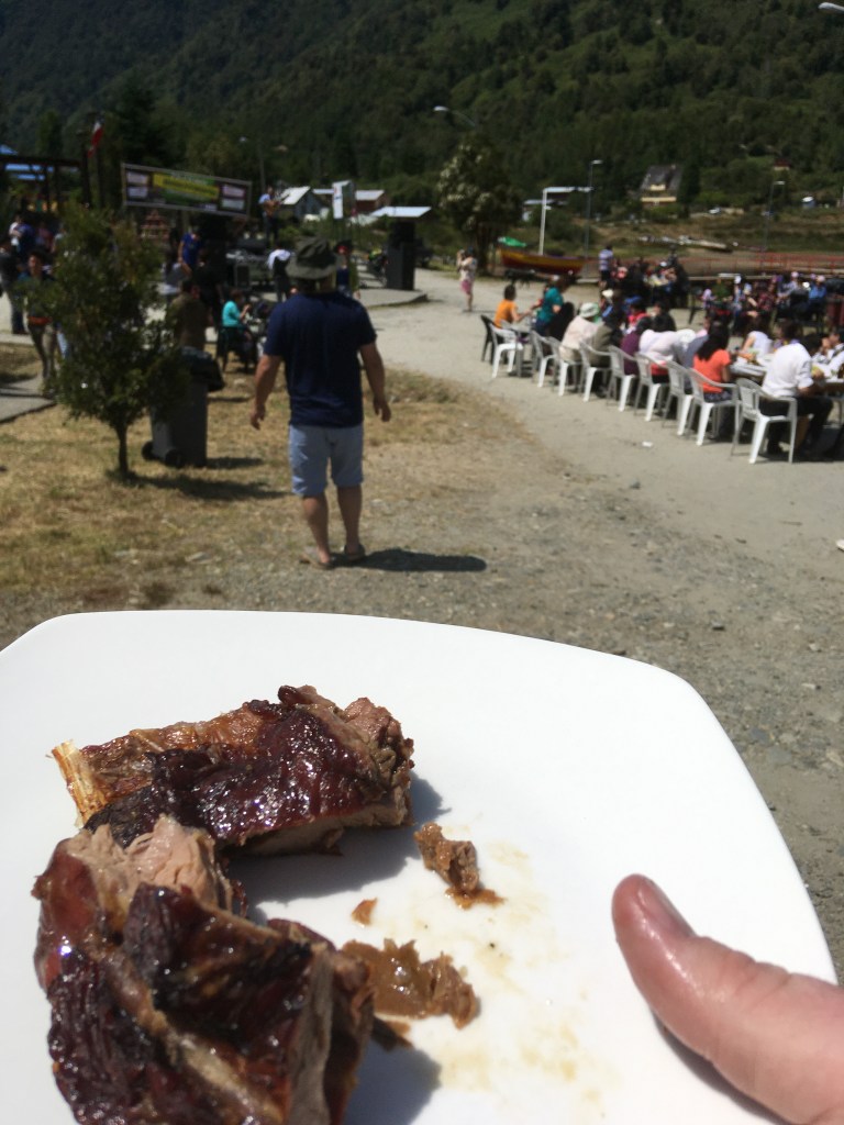 I traveled further down the Carretera Austral and was expecting a quiet stopover in this sleepy Hamlet. However, in another piece of luck, it turns out I landed on the weekend that the village is celebrating its anniversary. My super welcoming hosts at my little B&B presented me with a plate and explained that there is a massive village meal going on with loads and loads of meat and everyone is welcome! Vegetarians look away now… the meat was whole sides of lamb salted and pinned to a rack and left to cook in the heat from coals and the smoke within the cooking shed.