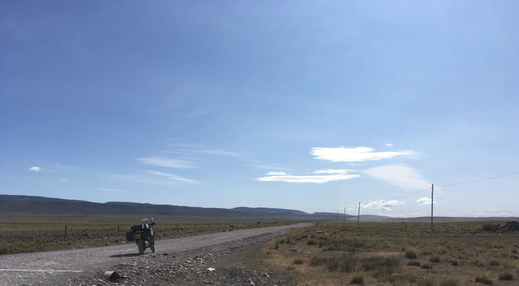 The first day on the “road” in Argentina was what I’d politely call a challenge. Immediately following the border I found myself on a gravel road, looking as far ahead as the eye can see with an uninterrupted view to the horizon, the same behind me, and the same to either side. No other vehicle in sight. I’d never seen a sky so big. It’s how I imagine Arizona/Utah/New Mexico to be.